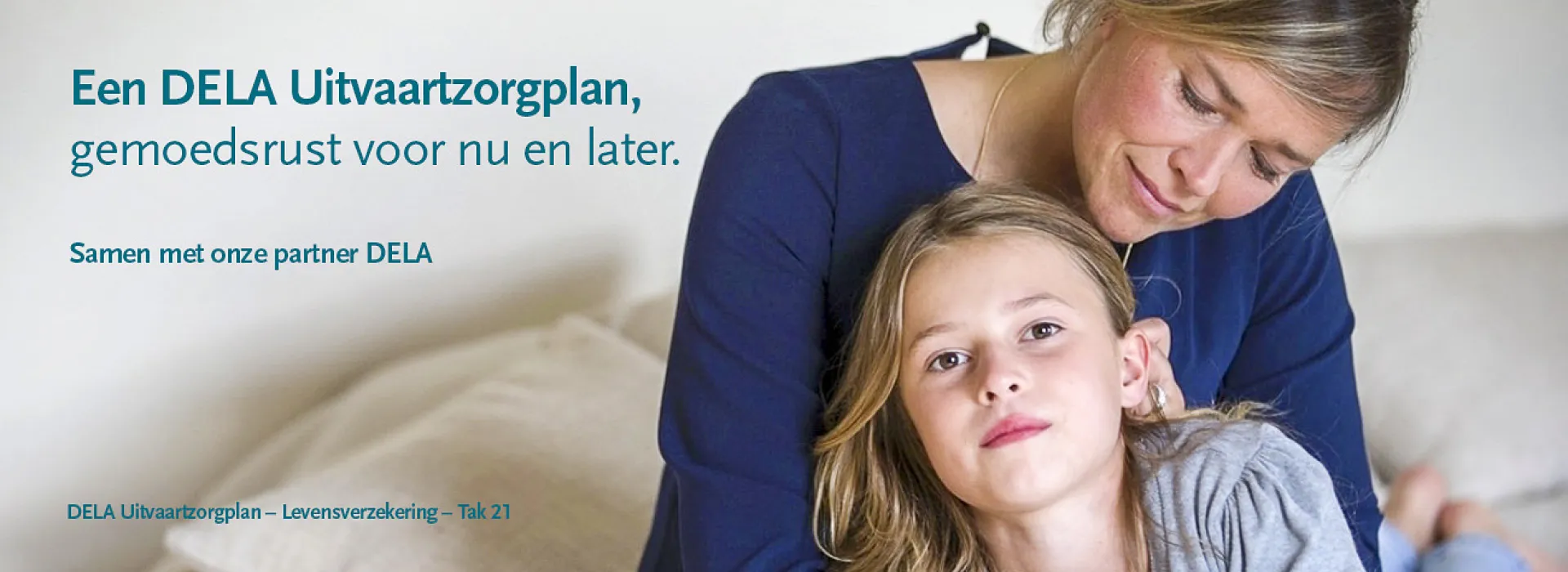 DELA Natura- en levensverzekeringen N.V.– Belgisch bijkantoor (ondernemingsnr. 0665.931.229) gelegen te Noorderplaats 5 bus 2 te 2000 Antwerpen, bijkantoor van DELA Natura- en levensverzekeringen N.V., vennootschap naar NL recht (KvK-nummer 17078393), gelegen teOude Stadsgracht 1, 5611DD Eindhoven, NL, toegelaten voor Tak 21 levensverzekeringen onder codenr. 2864; fabrikant DELA Uitvaartzorgplan, levensverzekering Tak 21 onderworpen aan BE recht - dekt levenslang uw uitvaartkosten voor het bedrag waarvoor u verzekerd bent. Offerte en premieberekening : www.dela.be en/of uw makelaar. Klachten: contact@dela.be of Ombudsman Verzekeringen (de Meeûsplantsoen 35, 1000 Brussel). Aan deze tekst kunnen geen rechten worden ontleend. Enkel de Algemene en Bijzondere Voorwaarden zijn bindend.